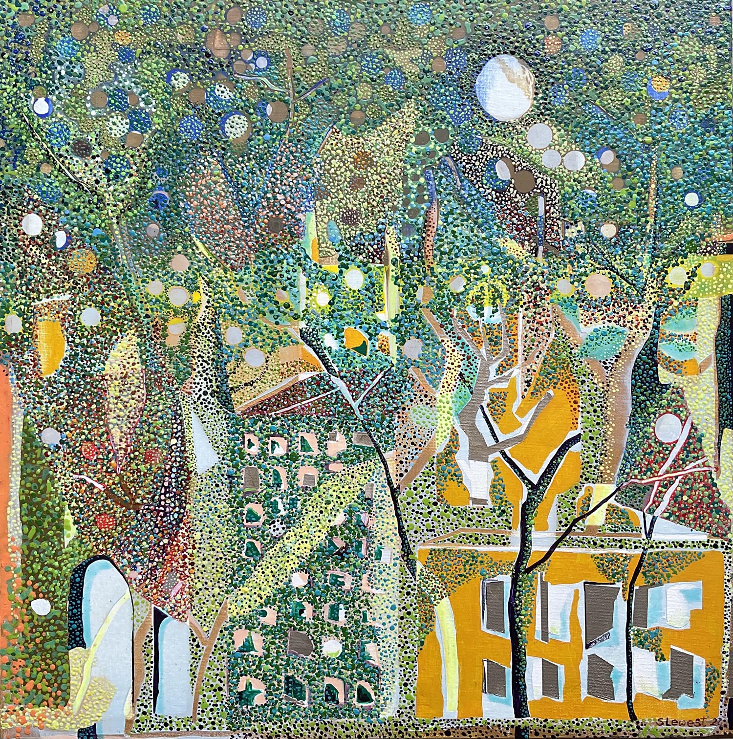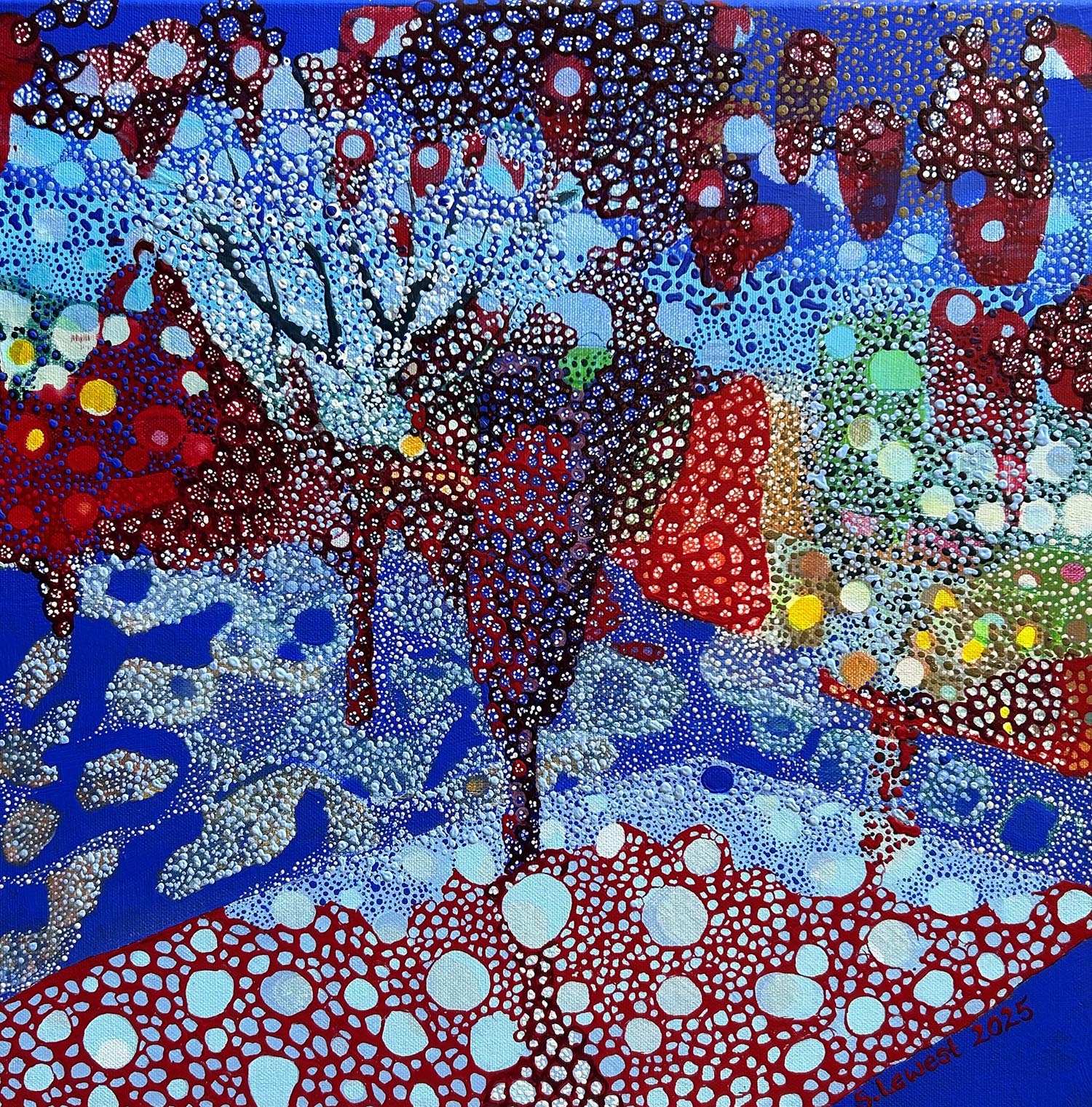 Les points — peints ou cousus — sont au cœur de son travail. Ils structurent l’espace, relient les formes et introduisent une dimension méditative au processus de création. Travaillant de manière intuitive, elle utilise l’acrylique en couches successives, laissant émerger les strates antérieures et donnant naissance à une profondeur mouvante. Principalement abstraites, ses œuvres peuvent accueillir des éléments de la nature, apparaissant spontanément au fil du geste.