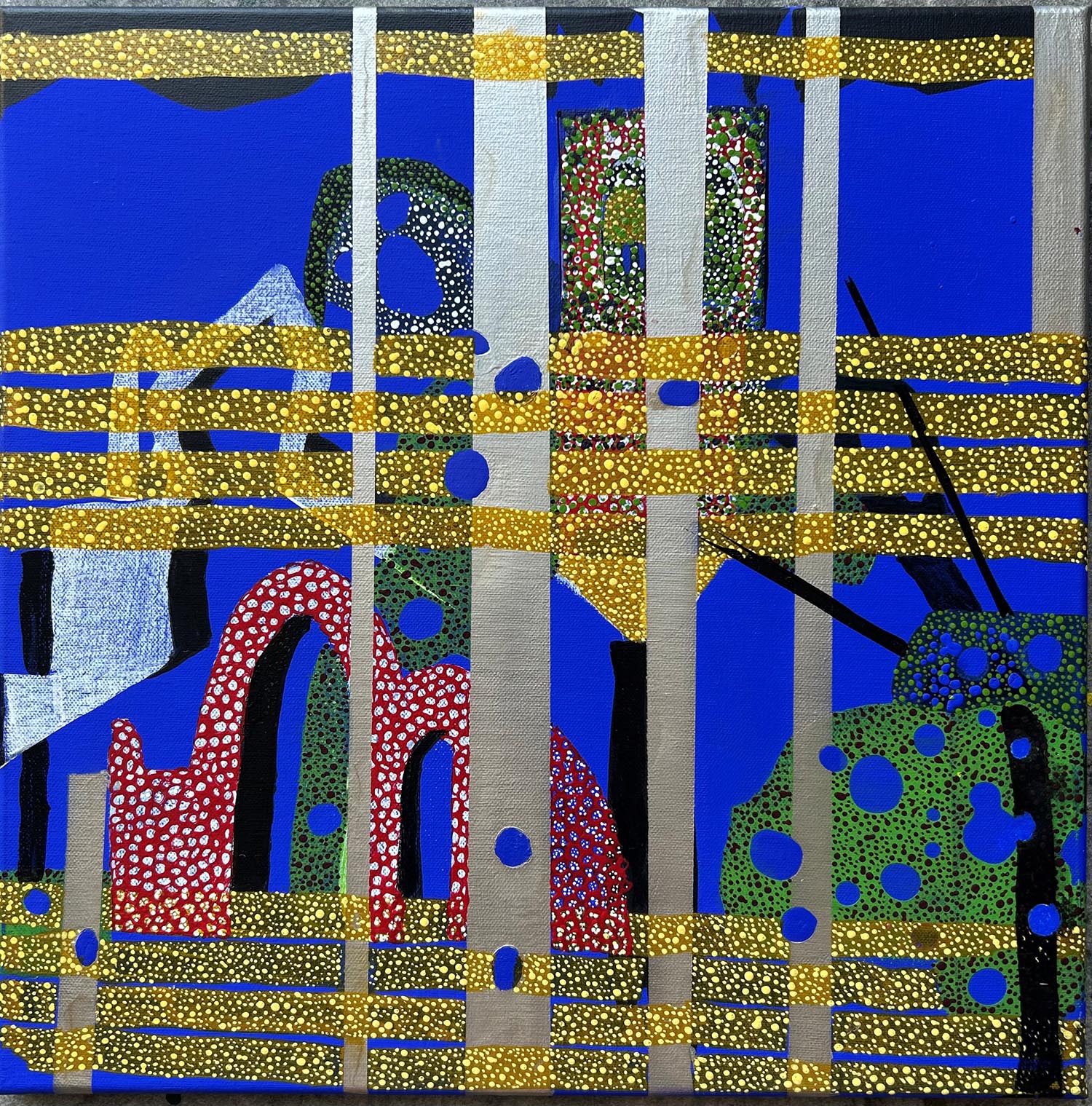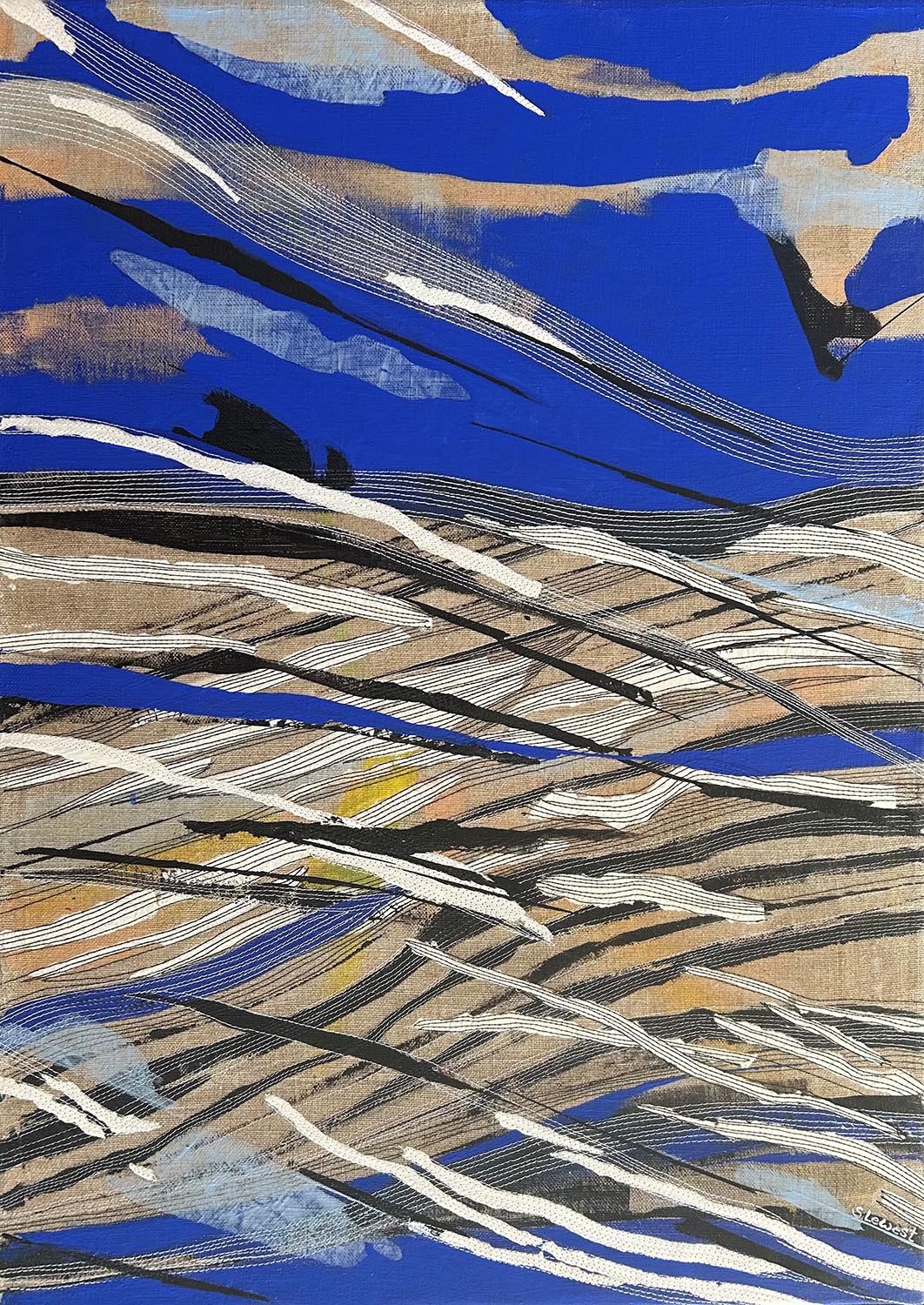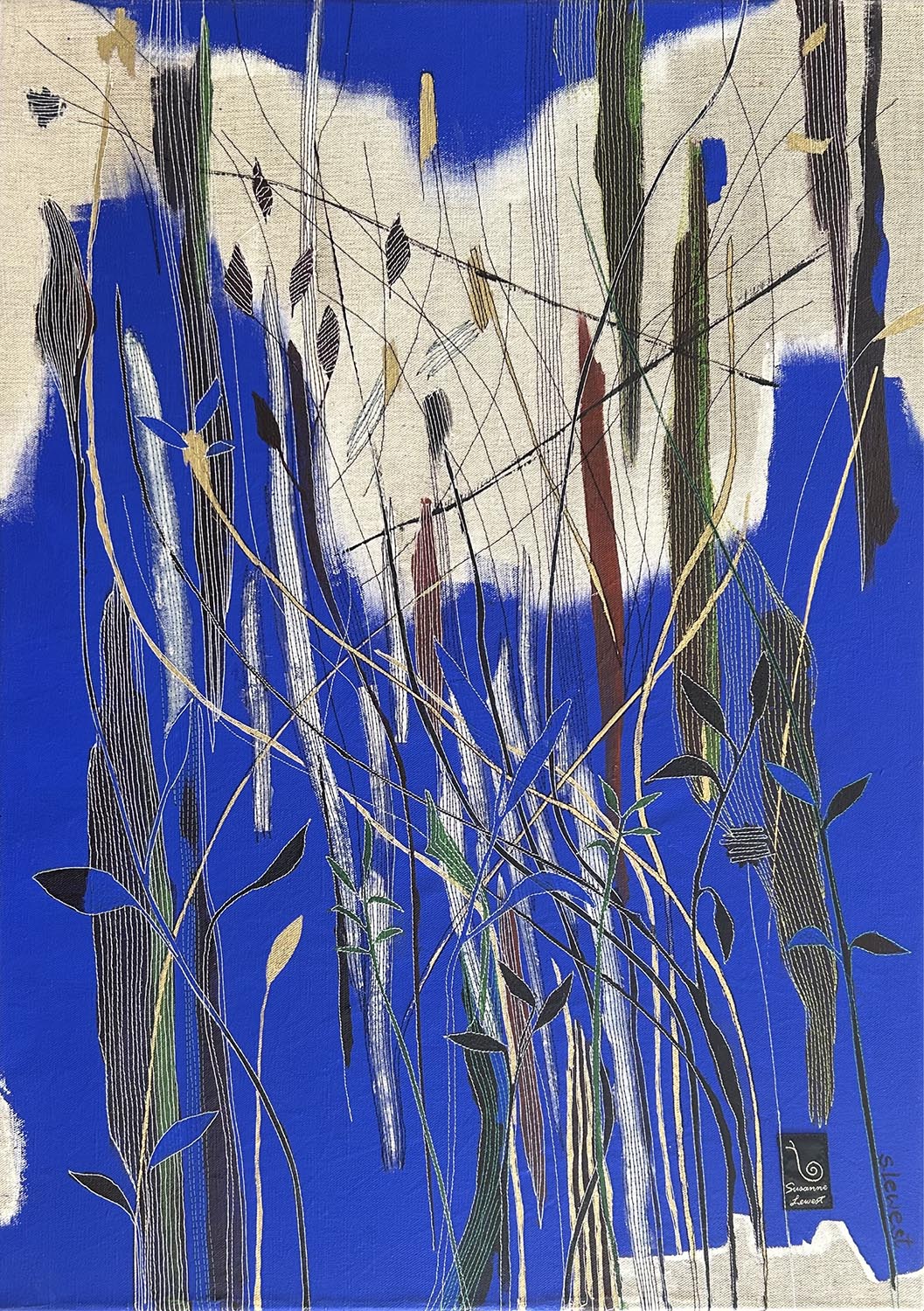 Dans ses peintures récentes, le bleu Klein agit comme fil conducteur, faisant écho à son passé de modiste et à son attachement au point comme trace, lien et mémoire. À travers cette alternance entre couture et peinture, elle cherche à proposer une vision organique, où les œuvres semblent se construire et évoluer comme des formes vivantes.