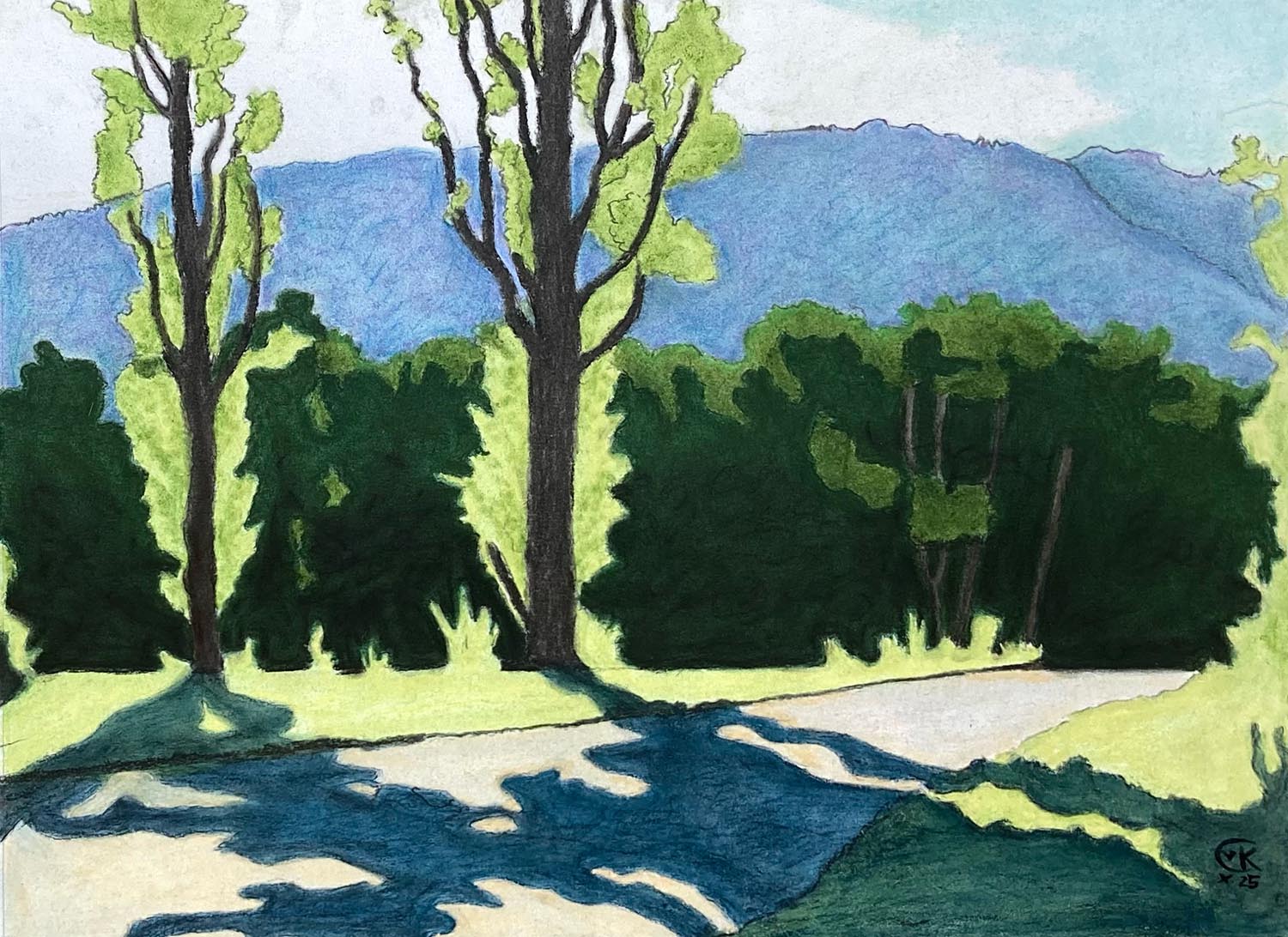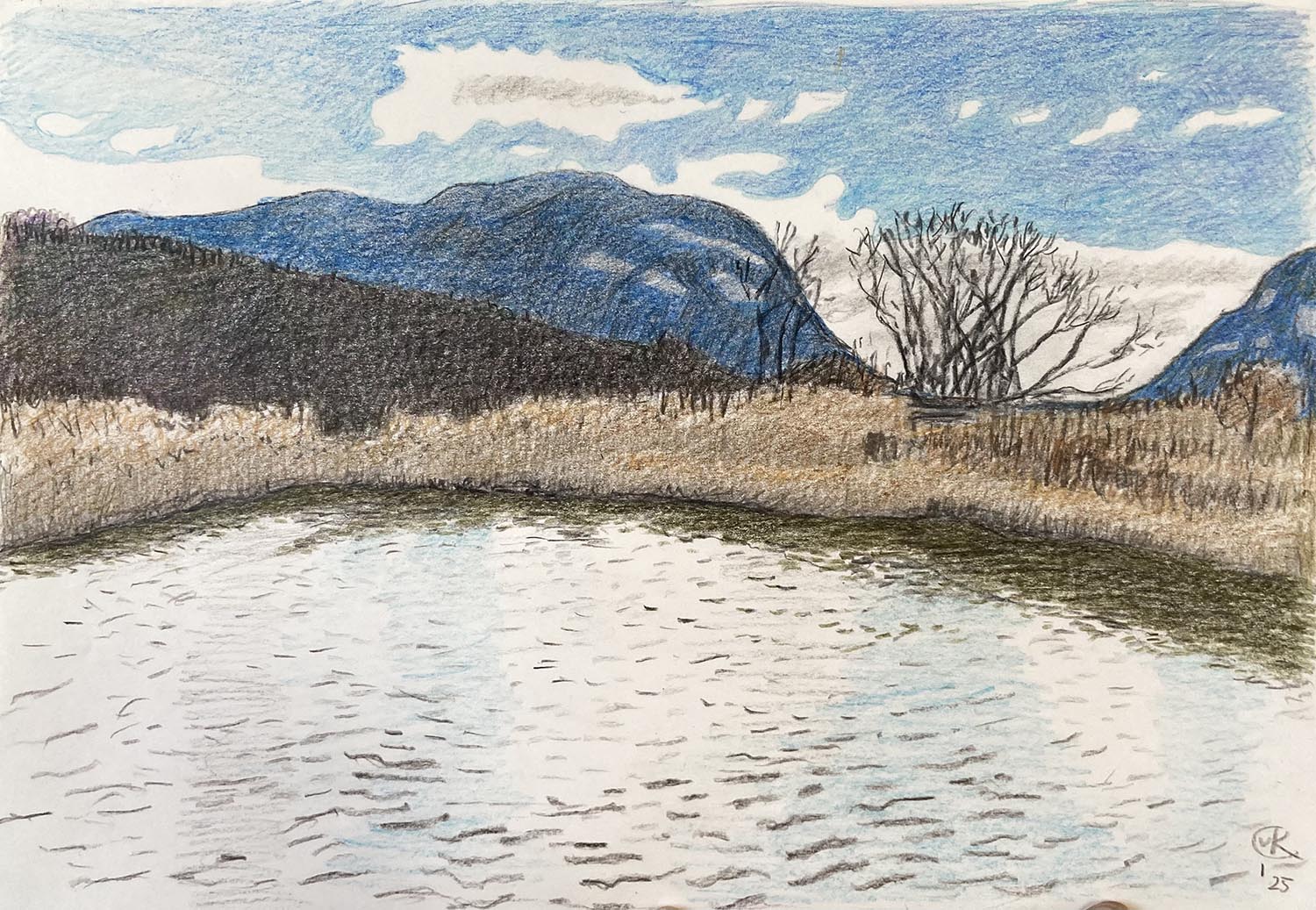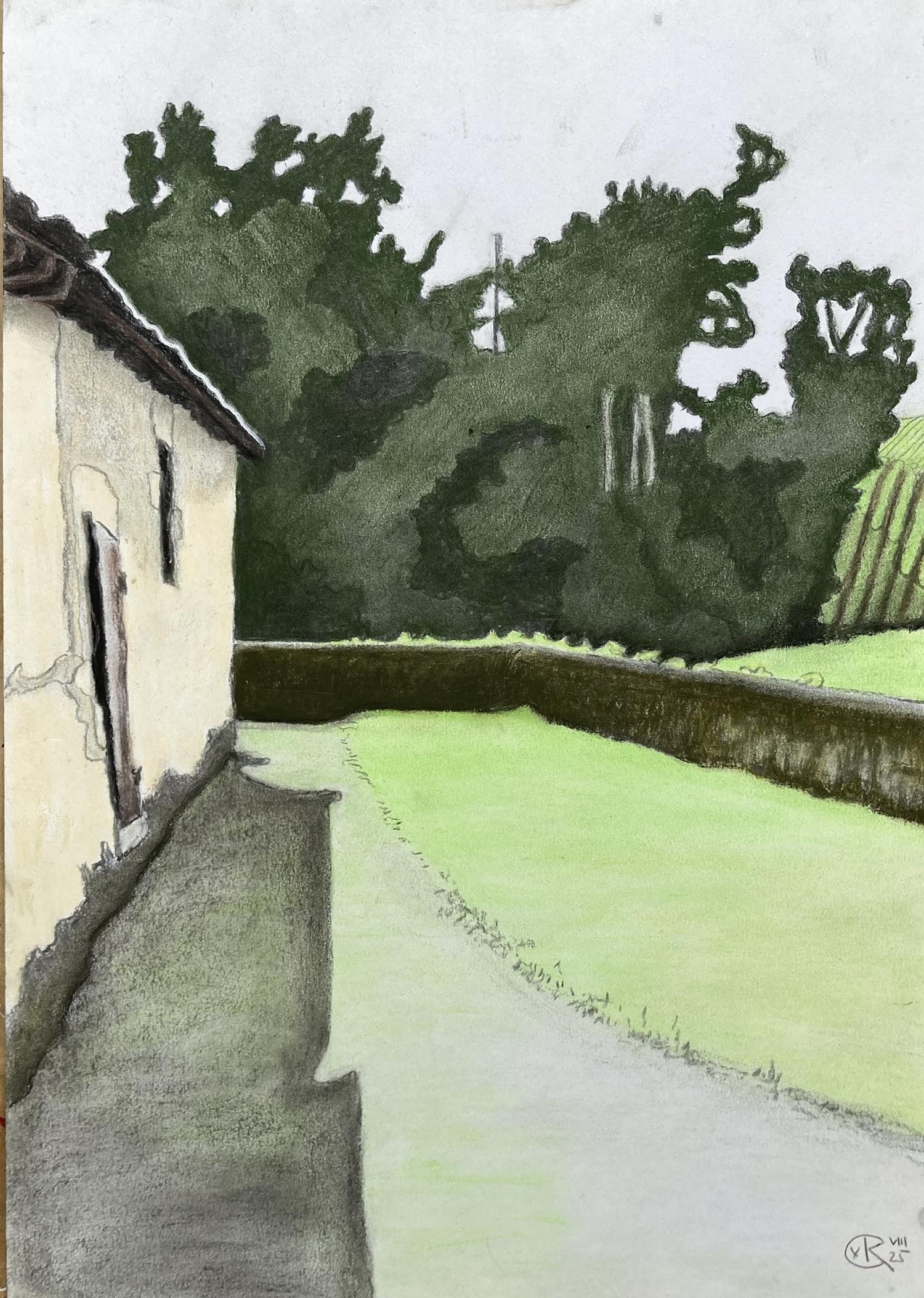 Ces dernières années, j’ai beaucoup travaillé autour de la nature. Depuis que je vis ici, je suis profondément fascinée par le paysage ; il est devenu un sujet central au cours de l’année écoulée. Le dessin a toujours occupé une place essentielle dans mon travail, et la ligne noire constitue pour moi un moyen stylistique presque indispensable. J’aime les couleurs intenses et, depuis quelques années, j’ai découvert le fusain et le pastel sec comme médiums. Il y a toujours un pot d’encre de Chine noire sur ma table de travail.